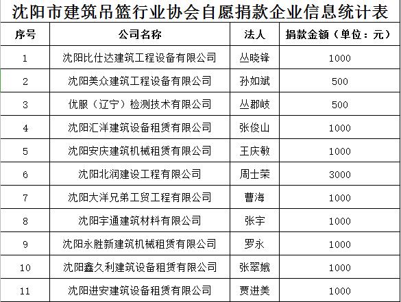 当前,新型冠状病毒感染的肺炎疫情肆虐,全国人民、各行各业在党中央国务院的坚强领导下,正在进行着一场没有硝烟的疫情阻击战,然而,战争的消耗是巨大的,只有快速阻击并取得胜利,全国人民才能安全!社会生产才能恢复!我们的行业才能复工!我们都是国家的一份子,更何况我们经营受益于国家、沈阳!为此,我们有责任有义务尽我们的微薄之力支持那些在一线为我们战斗的人们!2020年2月5日,由协会秘书长丛晓峰以个人名义倡导大家自愿捐款!本次捐款活动得到了近95%的会员的支持!后续具体捐赠事宜会继续跟进。另后附全款企业名单。