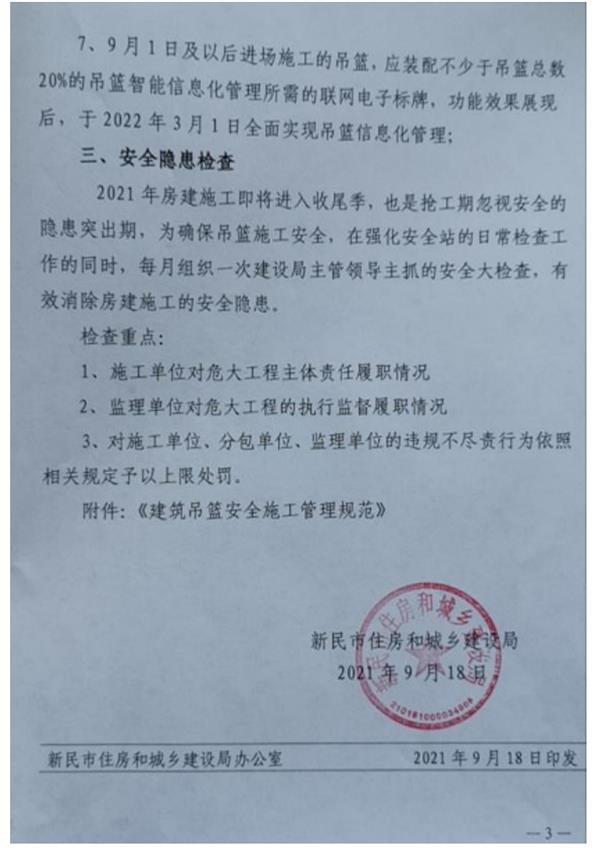 新民市住建局冠宇严格执行“建筑吊篮管理规范”地方标准的通知